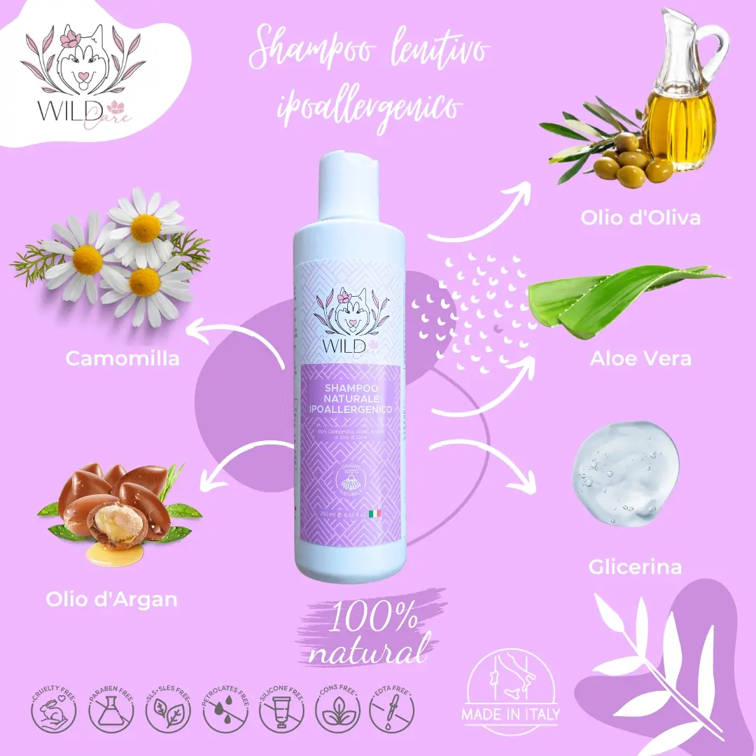 Shampoo Ipoallergenico lenitivo, delicato adatto sia per adulti che per cuccioli con cute sensibile, allevia il prurito e aiuta a lisciare i manti secchi e fragili. Si prende cura della cute e del manto idratando e nutrendo a fondo. PH bilanciato che rispetta la pelle, evitando allergie ed irritazioni, che con l’uso costante possono migliorare e ridursi, grazie agli estratti di Camomilla, Aloe, Olio di Argan, Glicerina e d’Oliva.